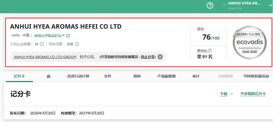 近日,全球权威企业可持续发展评级机构EcoVadis正式发布2026年度评估结果,华业香料股份有限公司及所属合肥公司凭借优异表现,分别以78分、76分的成绩成功获评EcoVadis银牌评级,分别位居全球前7%、前9%行列。