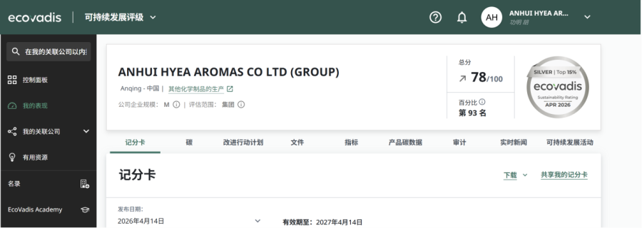 近日,全球权威企业可持续发展评级机构EcoVadis正式发布2026年度评估结果,华业香料股份有限公司及所属合肥公司凭借优异表现,分别以78分、76分的成绩成功获评EcoVadis银牌评级,分别位居全球前7%、前9%行列。